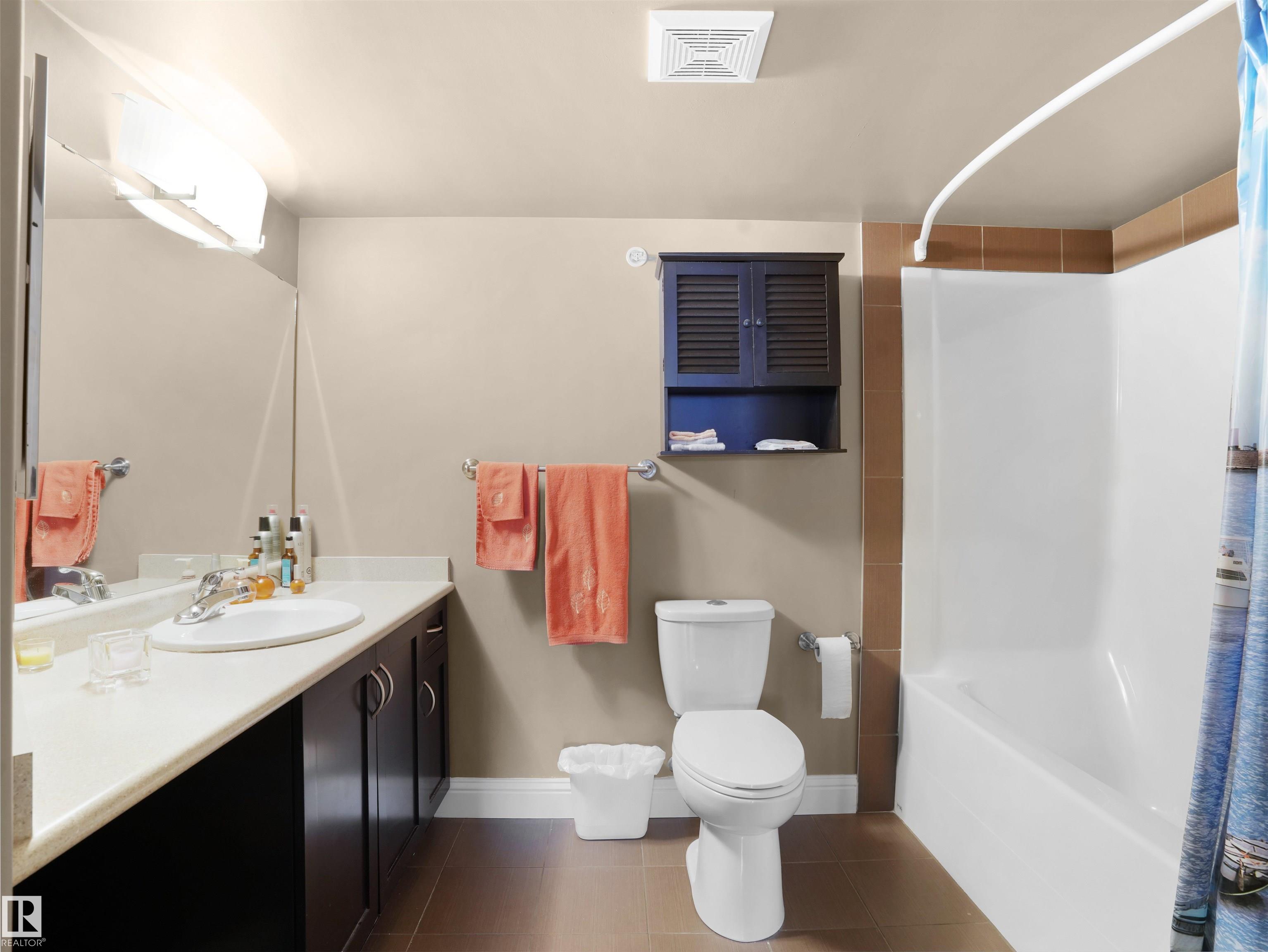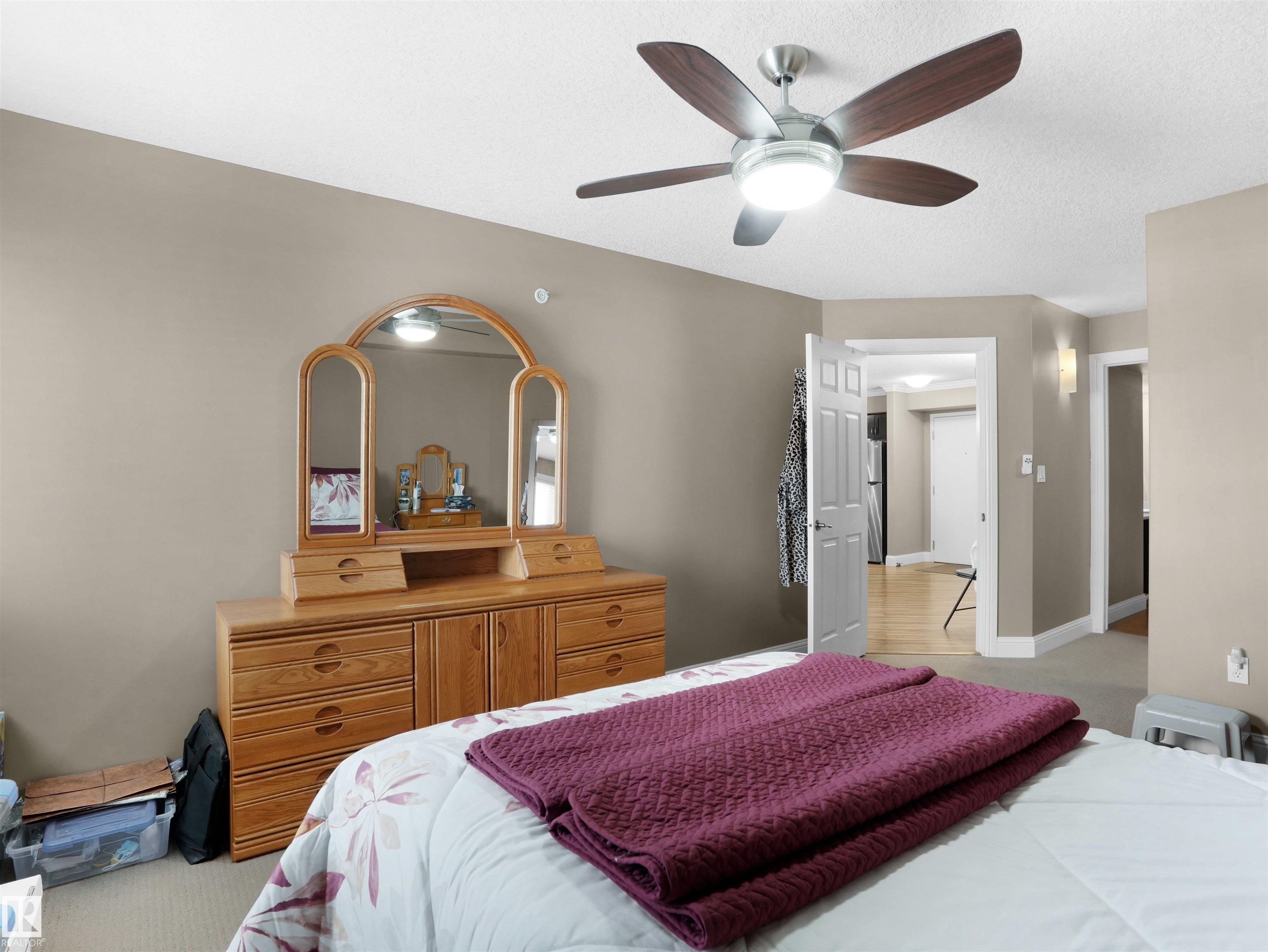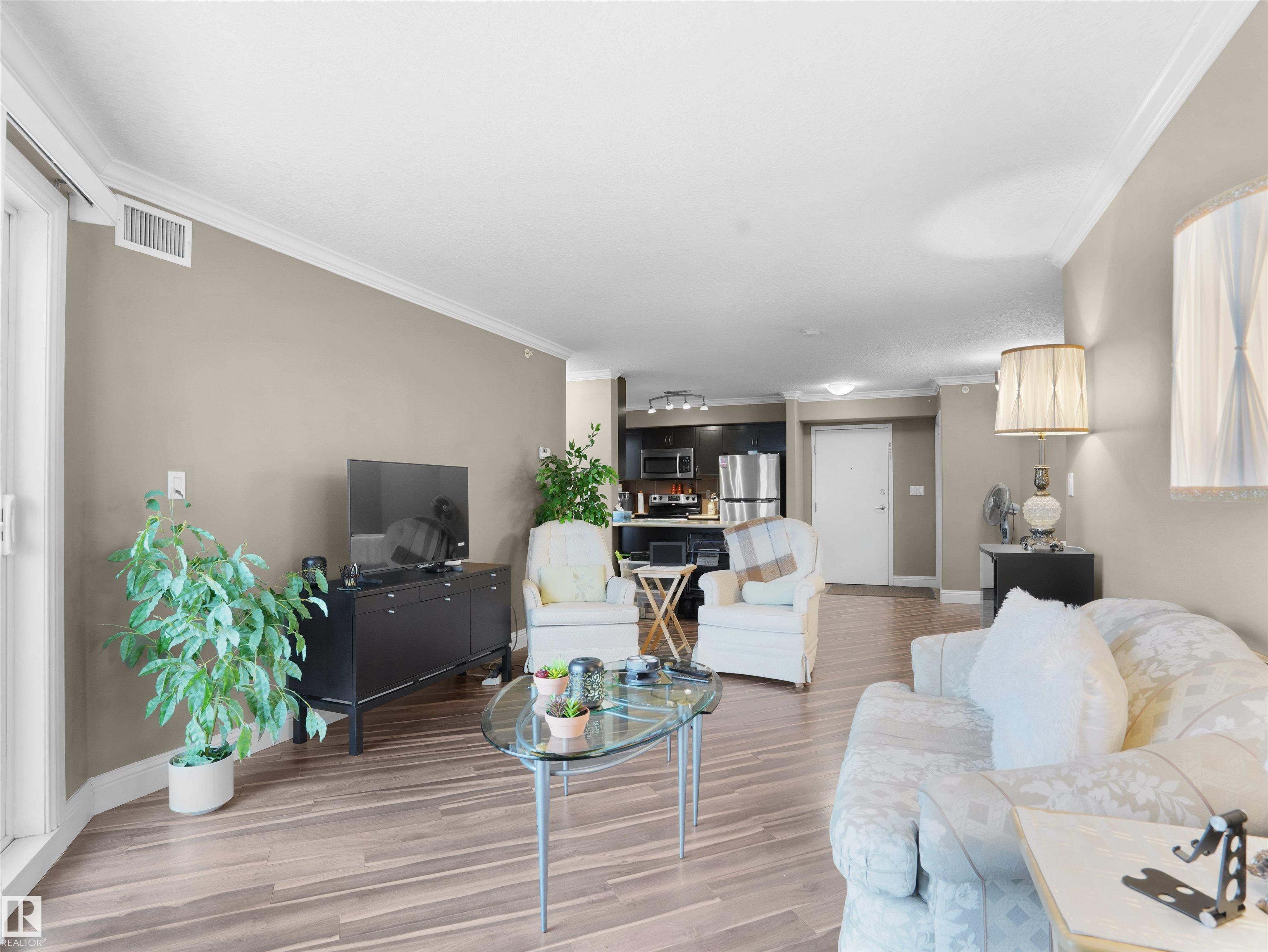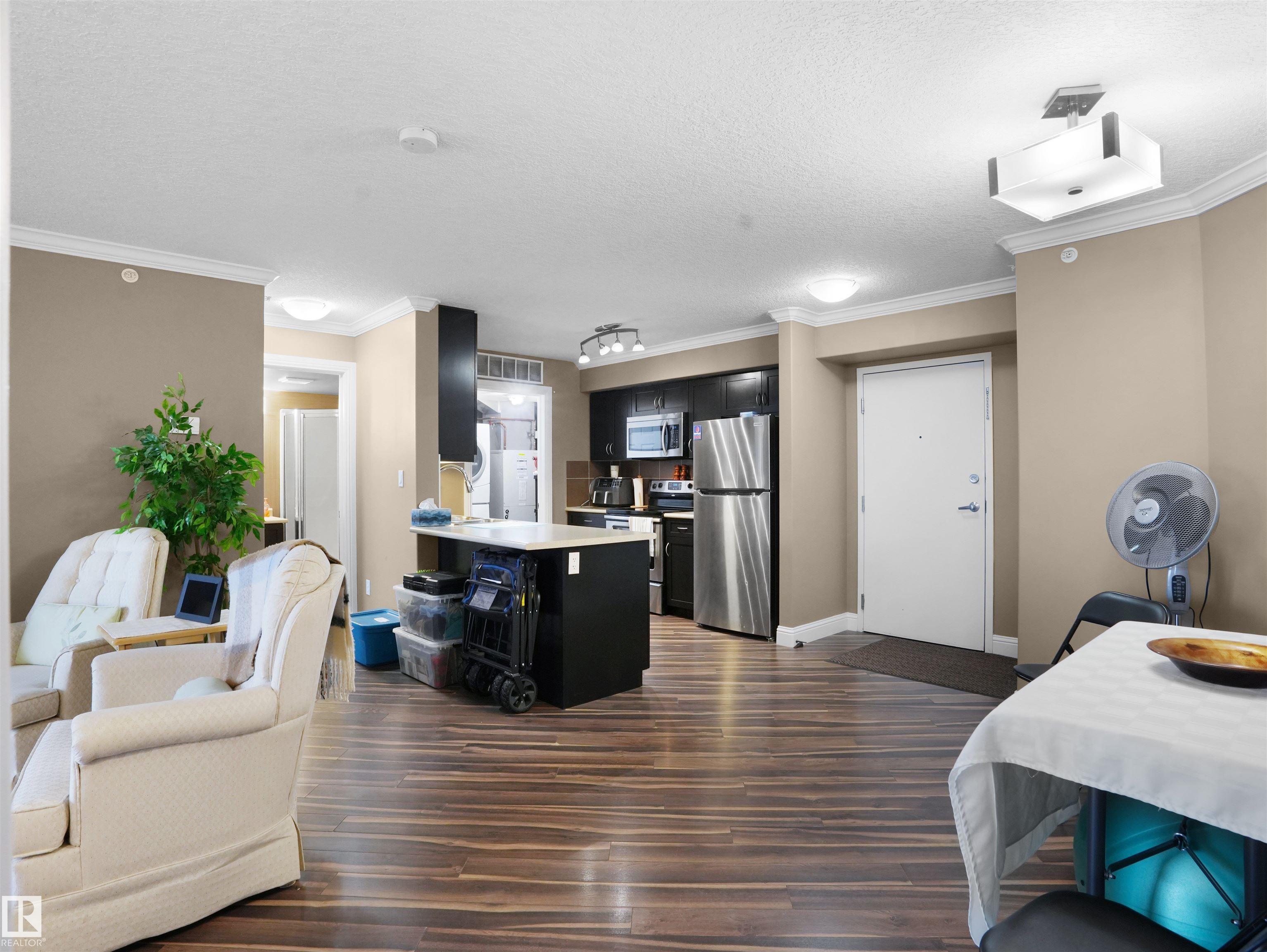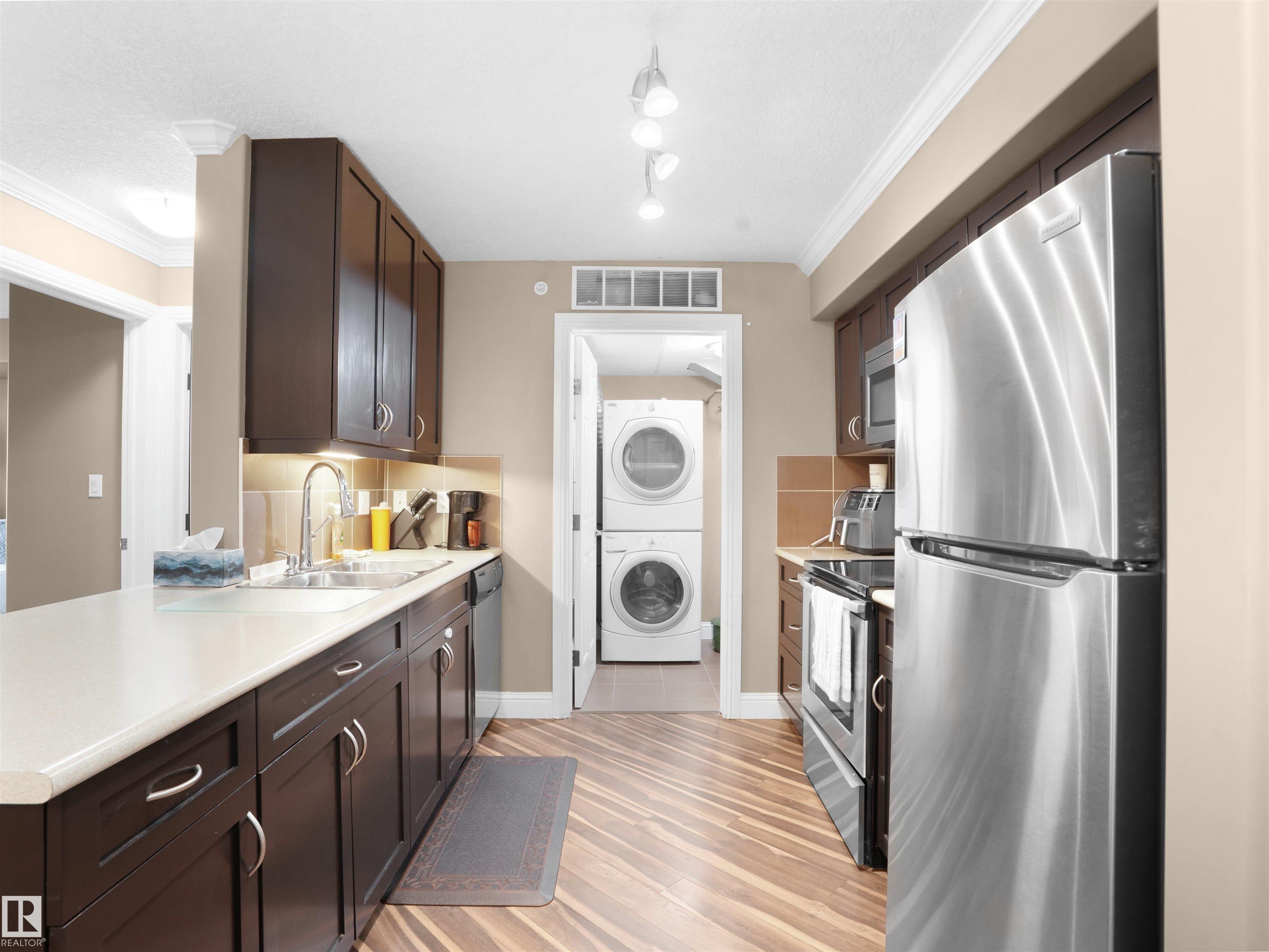 Welcome to this exceptional top floor condo featuring a sunny south facing balcony and close proximity to all amenities. This well designed unit offers 2 bedrooms, 2 bathrooms, and 2 titled parking stalls. Step inside to an open-concept kitchen and dining area highlighted by stainless steel appliances, ample cabinetry, and a peninsula island with breakfast bar, providing generous counter space and storage. Convenient in-suite laundry includes a front-load washer and dryer. The spacious living room showcases crown Mouldings and stylish laminate flooring, and leads to your private south-facing balcony with natural gas BBQ hookup. The large primary bedroom features a walk-in closet and a luxurious 5 piece ensuite. Completing this home are one underground heated parking stall with storage and one outdoor stall.