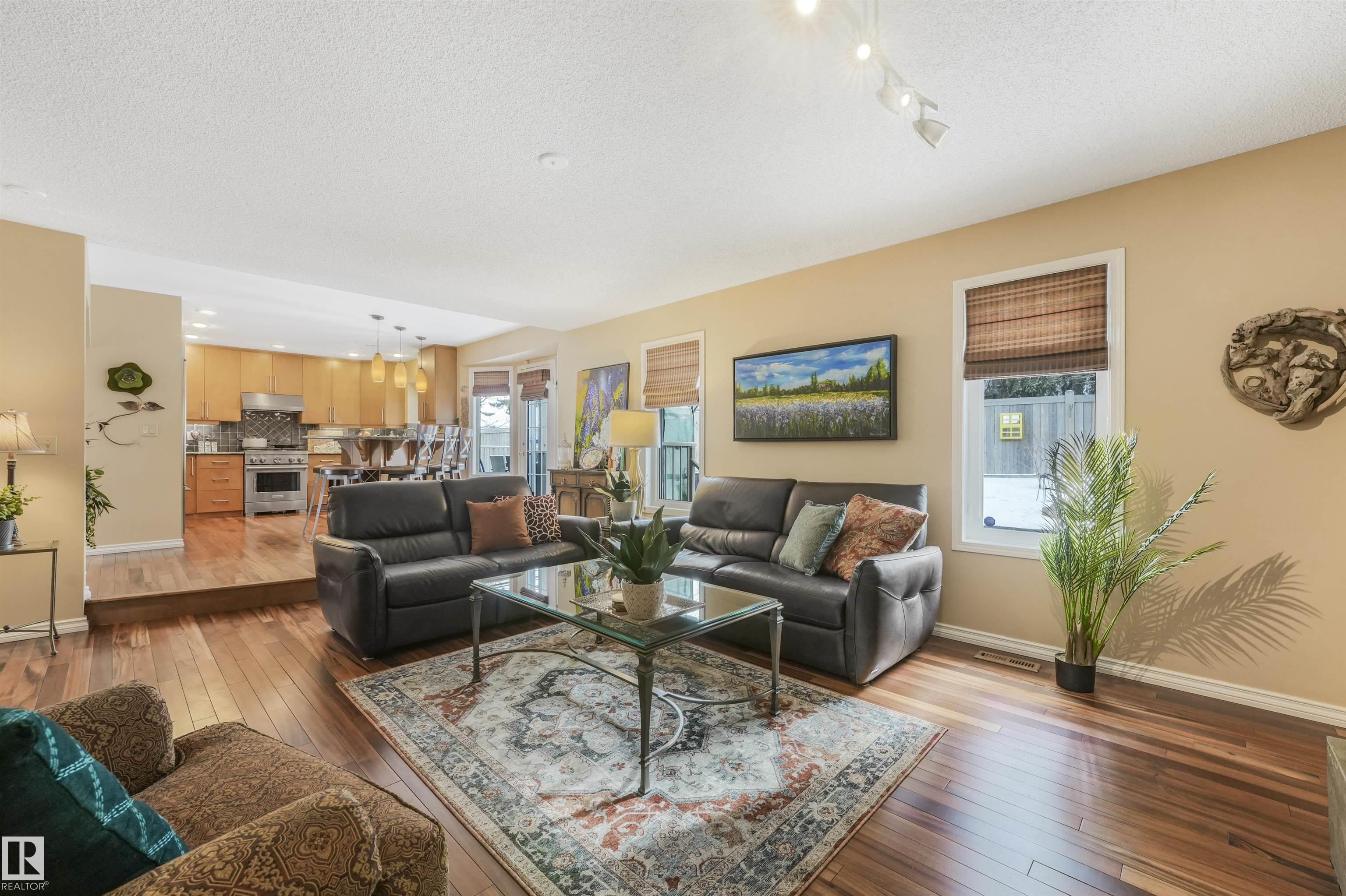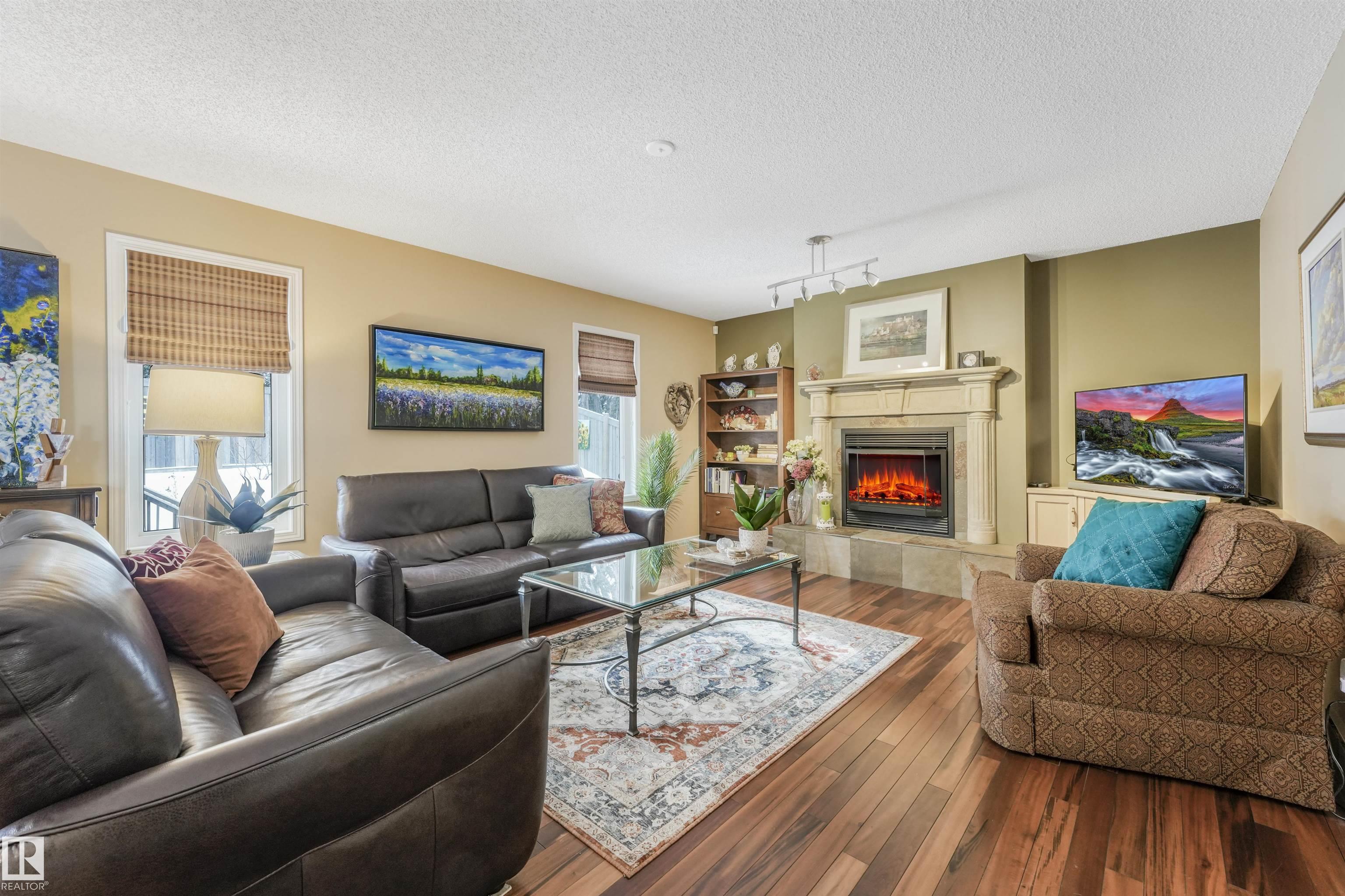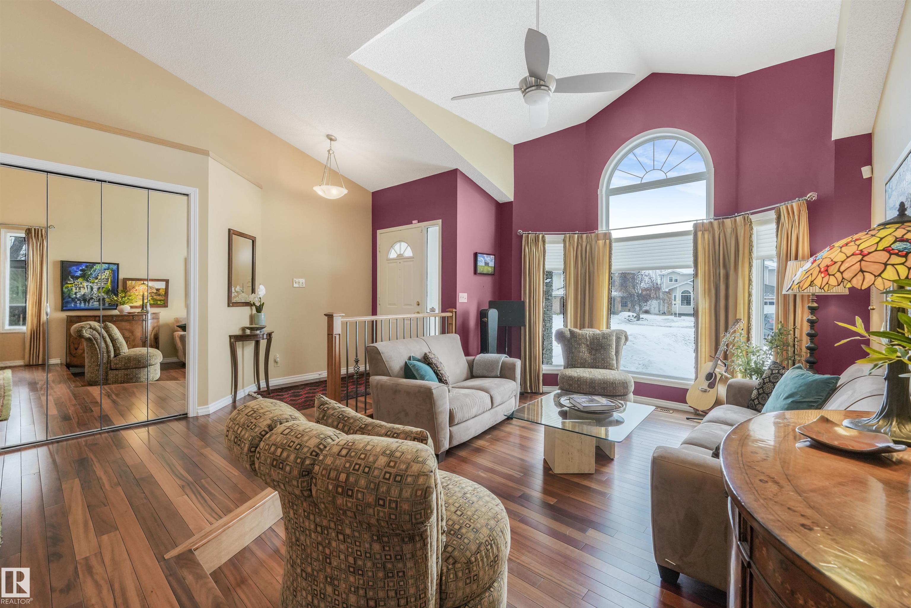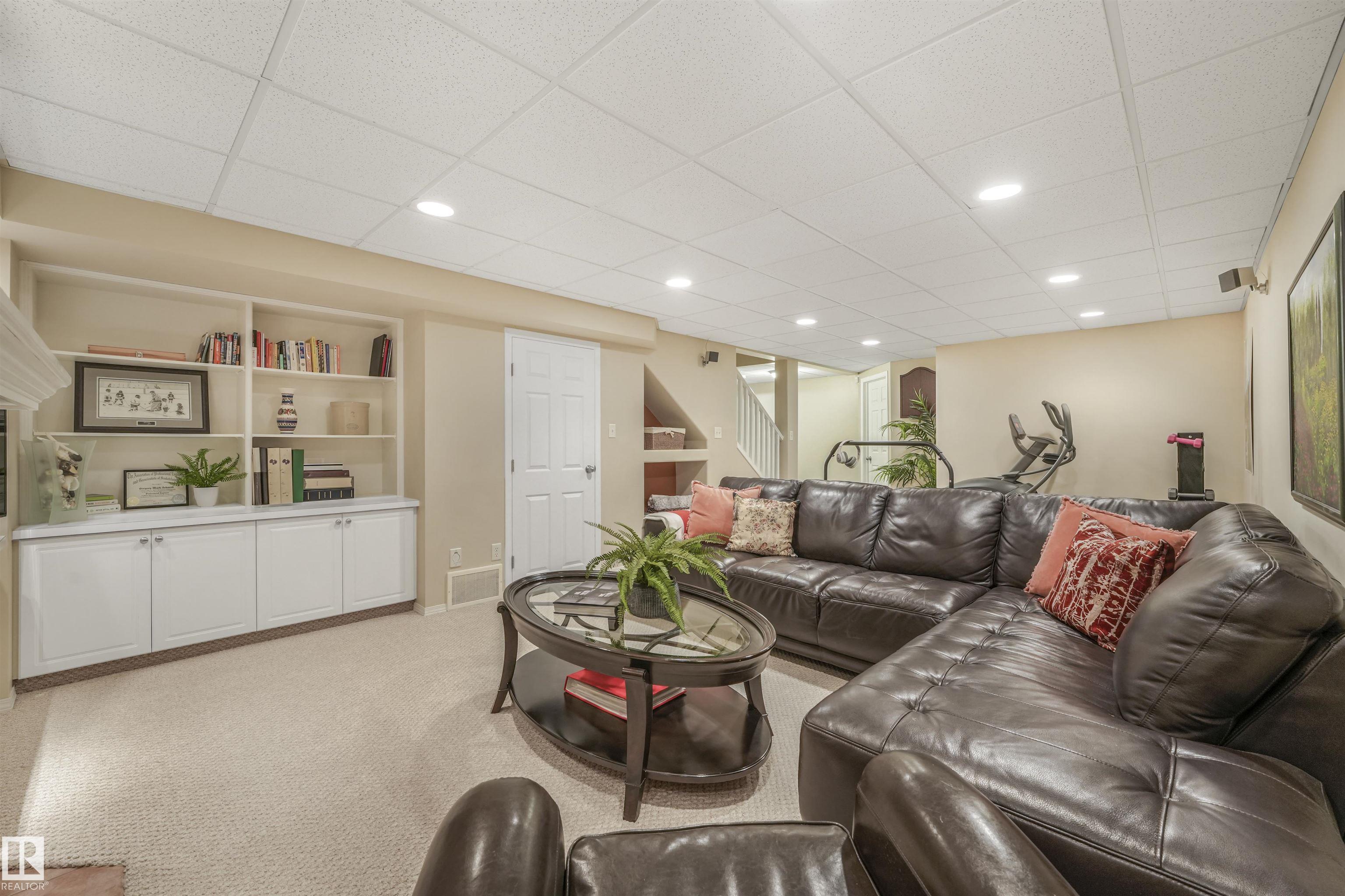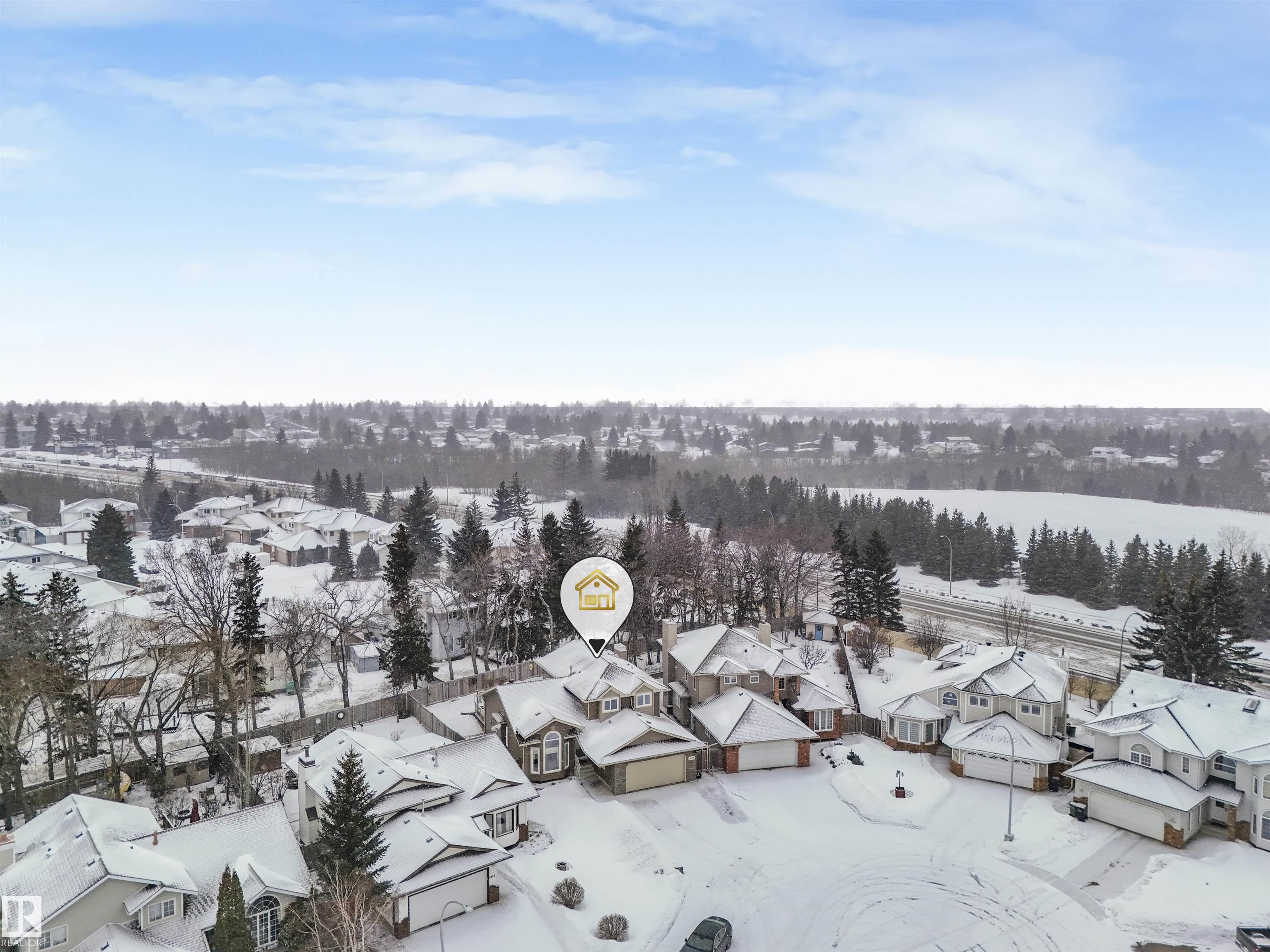 Tucked away in a quiet cul-de-sac in Jackson Heights, this well-maintained home sits on a beautifully landscaped pie-shaped lot. The private backyard is fully fenced with a composite deck & gas BBQ hookup. The main level showcases tiger hardwood throughout and a bright living room with vaulted ceilings. The kitchen offers granite counters, gas stove, SUB-ZERO FRIDGE, and corner appliance garage/bread box. A cozy family room with a gas fireplace, main floor office, and 3-pc bath complete the level. Upstairs has new carpet, primary suite with WIC and 3-pc ensuite, plus an additional 2 bedrooms and a 4-pc bath. The finished basement provides a large rec room with 2ND GAS FIREPLACE, plus built-in shelving, bedroom, 3-pc bath, laundry, and ample storage. Major updates incl. triple-glazed windows, A/C (2015), sump pump (2020), HWT (2020), furnace (2022), and Telus security system w/cameras. Fantastic location just steps to Jackie Parker Park, a short walk to Jackson Heights School, and access to the Whitemud!