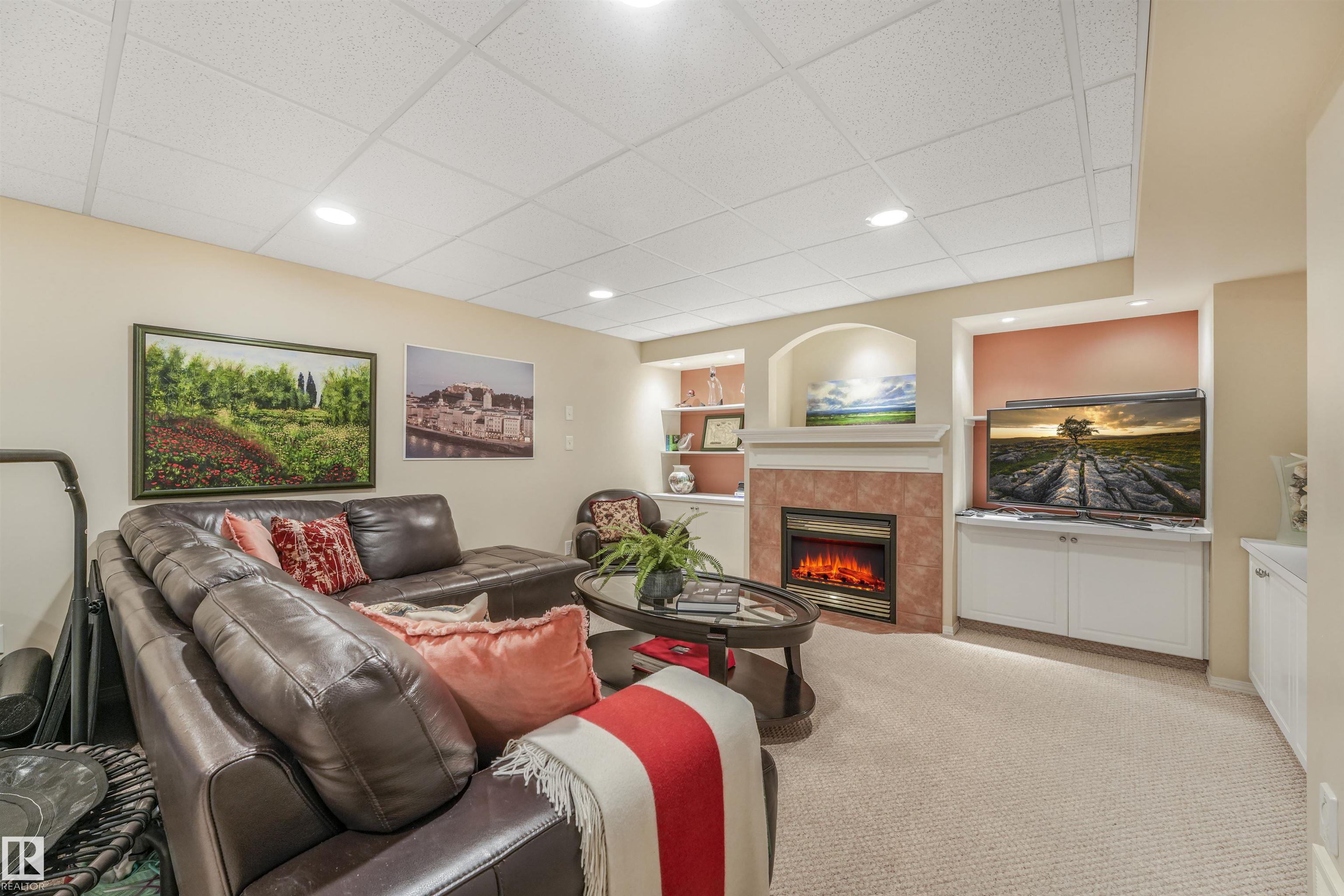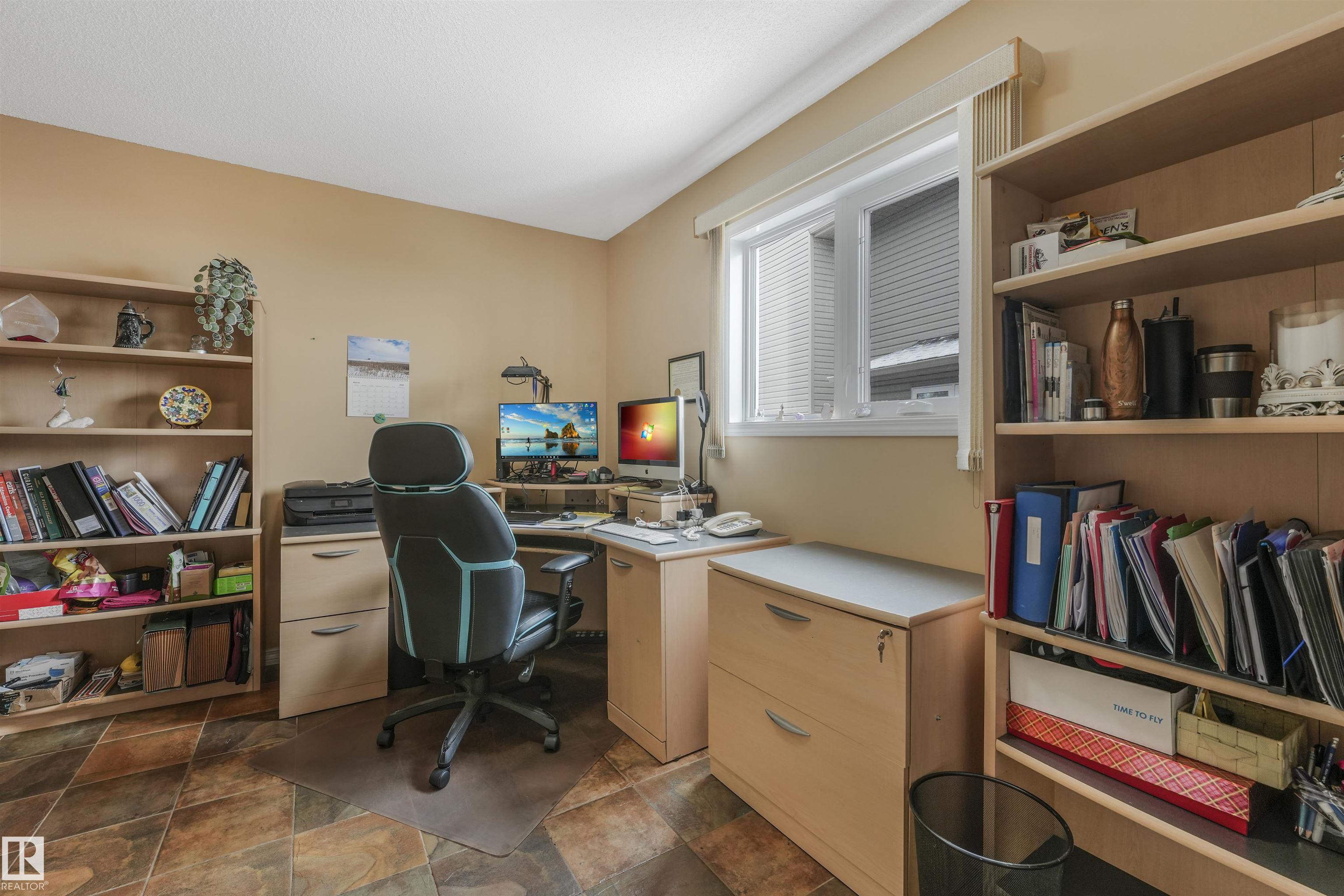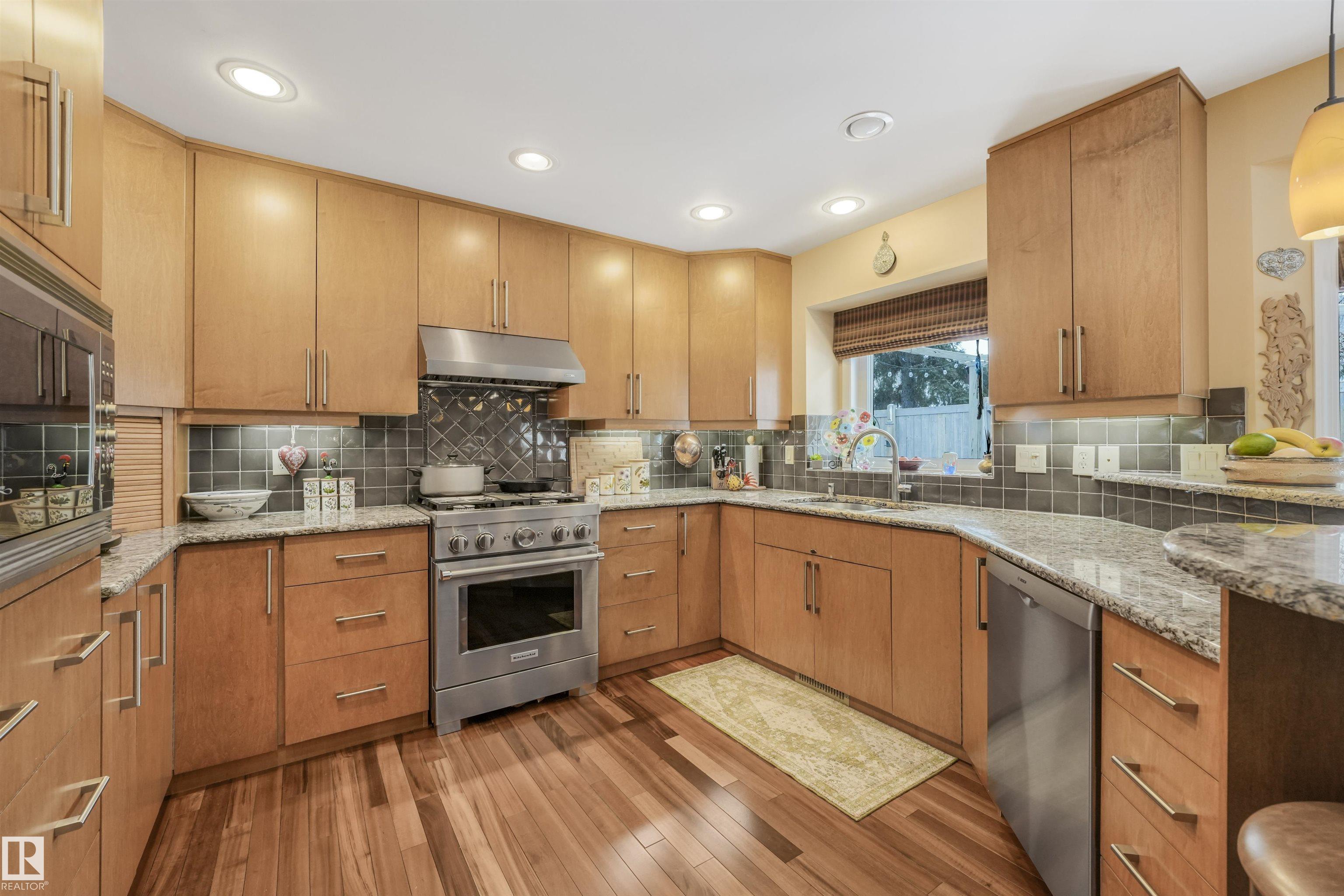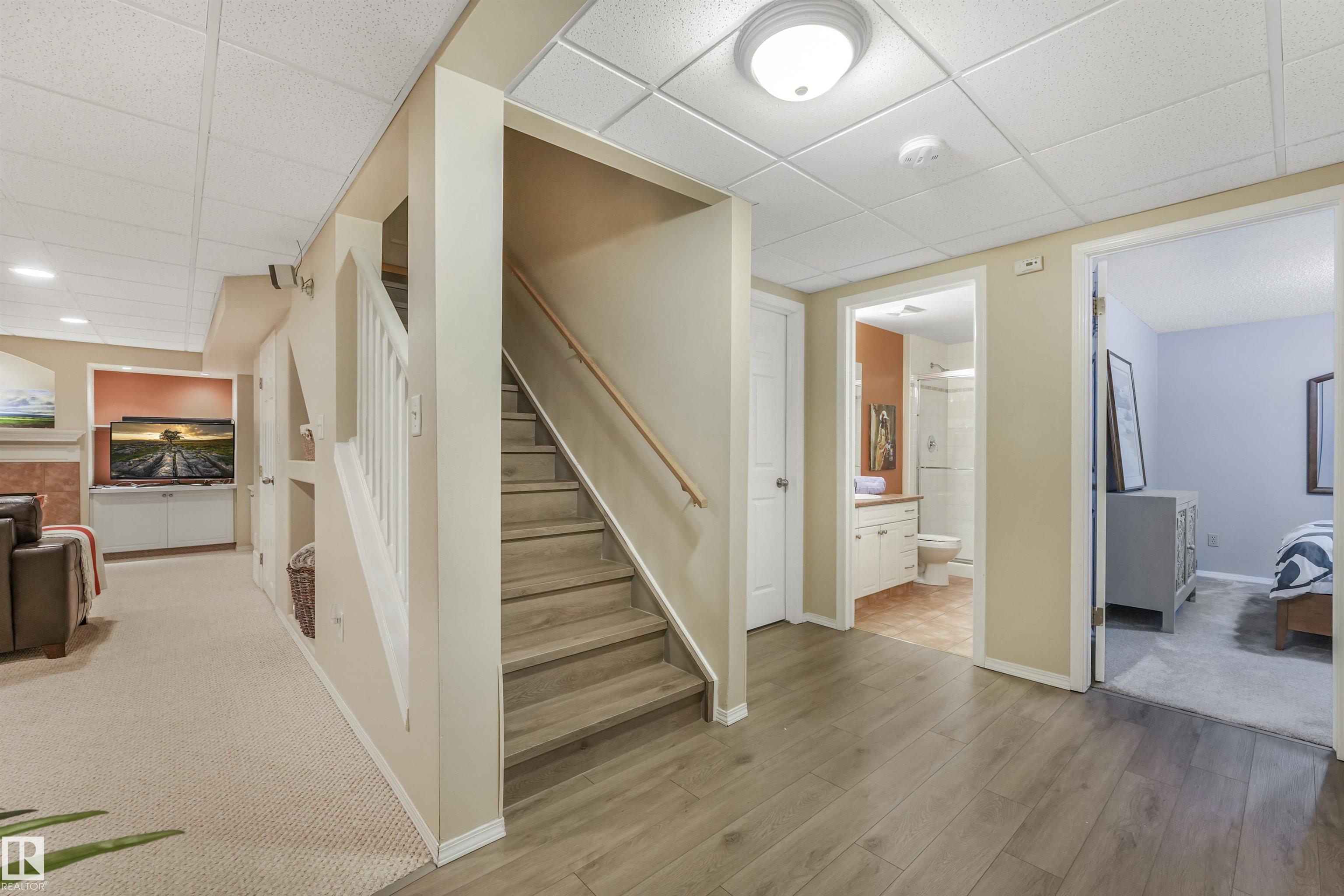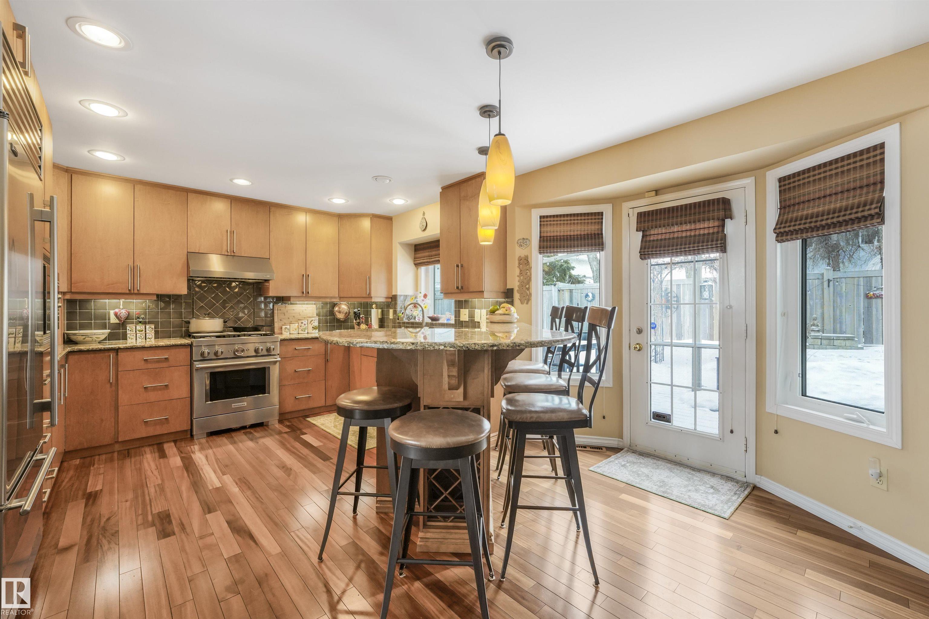Tucked away in a quiet cul-de-sac in Jackson Heights, this well-maintained home sits on a beautifully landscaped pie-shaped lot. The private backyard is fully fenced with a composite deck & gas BBQ hookup. The main level showcases tiger hardwood throughout and a bright living room with vaulted ceilings. The kitchen offers granite counters, gas stove, SUB-ZERO FRIDGE, and corner appliance garage/bread box. A cozy family room with a gas fireplace, main floor office, and 3-pc bath complete the level. Upstairs has new carpet, primary suite with WIC and 3-pc ensuite, plus an additional 2 bedrooms and a 4-pc bath. The finished basement provides a large rec room with 2ND GAS FIREPLACE, plus built-in shelving, bedroom, 3-pc bath, laundry, and ample storage. Major updates incl. triple-glazed windows, A/C (2015), sump pump (2020), HWT (2020), furnace (2022), and Telus security system w/cameras. Fantastic location just steps to Jackie Parker Park, a short walk to Jackson Heights School, and access to the Whitemud!
